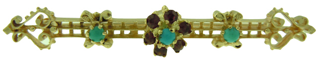 14kt yellow gold garnet and turquoise bar pin