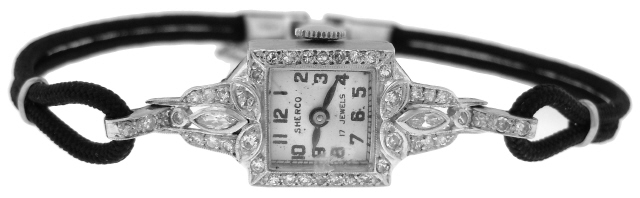 Platinum antique style ladies Sherco diamond watch with black cord strap