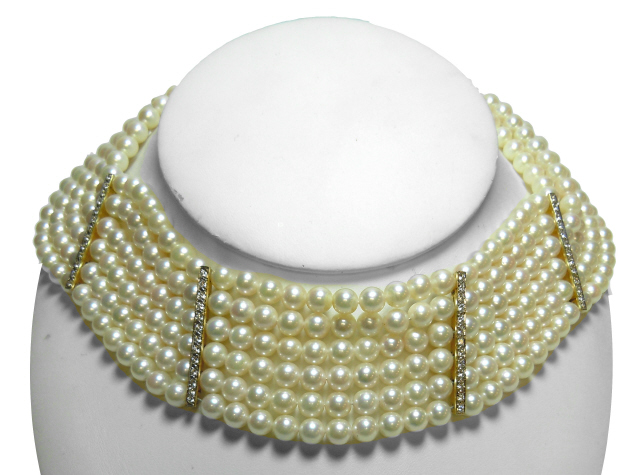 Six row 6-6.5mm cultured pearl collar/14kt yellow gold clasp/diamond dividers