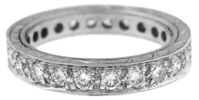 14kt white gold diamond eternity band with engraved sides.