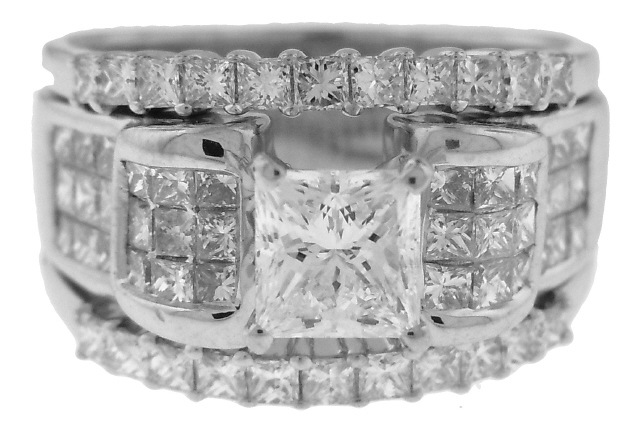 18kt white gold princess cut diamond solitaire with attached 14kt diamond guard