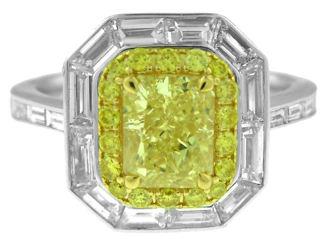 Radiant cut diamond=1/1.26cts Fancy Yellow VVS1 GIA 5243247010 6.35x5.12x3.90mm 76.2D 60T EX/VG F Round fancy yellow diamonds=18/.20tw White baguette diamonds=20/1.03tw F-G VS