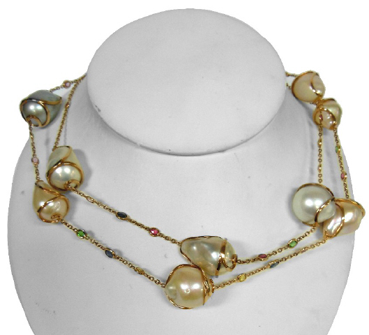 18kt yellow gold 48" baroque pearl and bezel set multi-color stone necklace.