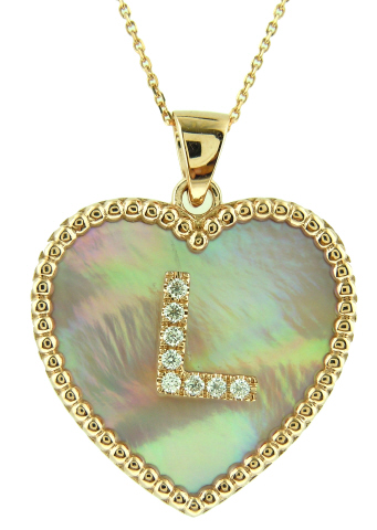 14kt rose gold pink MOP heart diamond "L" pendant with chain.