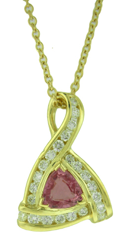 14kt yellow gold triangular pink sapphire and diamond pendant