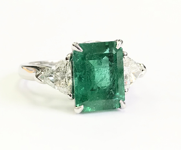 Emerald cut emerald=1/3.44cts, minor clarity enhanced GIA Emerald Report 1182917636 10.77x8.20x5.39mm Trillion diamonds=2/.81tw G-H VS2-SI1