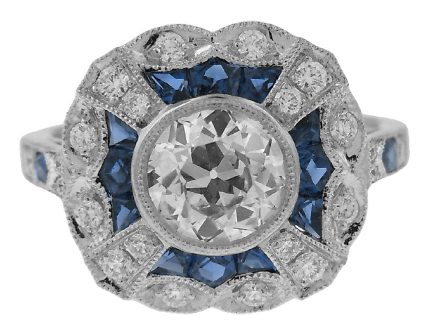 Platinum ring with .87 Old European Cut Diamond .87ct F SI1 EGL, sapphires and diamonds