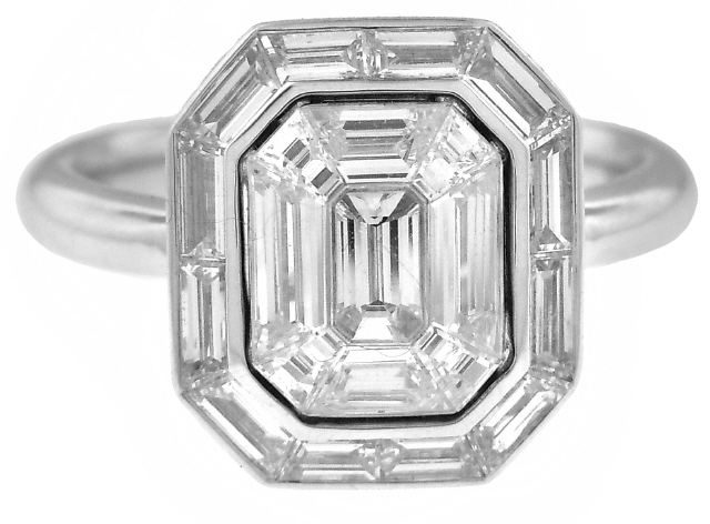 18kt white gold invisible set baguette and emerald cut diamond ring.