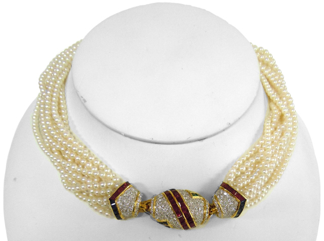 12-strand pearl necklace with 18kt yellow gold ruby, sapphire, emerald and diamond clasp.