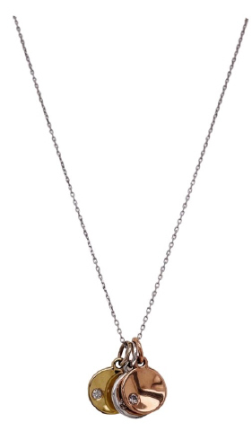 14kt tri-color disc necklace with 16" white gold chain.