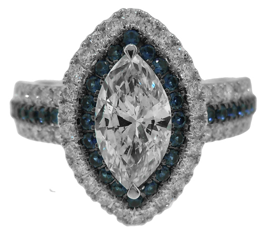 Marquise diamond=1/1.00ct E SI1 EGL US 314413001D 10.13x5.42x3.18mm 58.7D 58T G/G N Diamonds=58/.55tw F-G VS Sapphires=38/.40tw