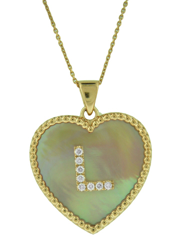 14kt rose gold pink mother of pearl "L" diamond heart pendant with chain.