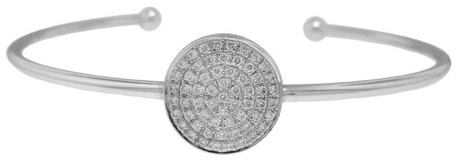 18kt white gold cuff bangle bracelet with circle diamond centerpiece.