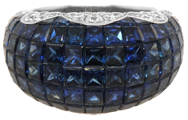Platinum invisible set sapphire and diamond ring.
