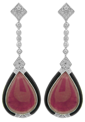Platinum pear shape cabochon ruby, diamond, and black onyx dangle earrings