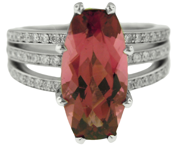 14kt white gold pink tourmaline and diamond ring with platinum head.