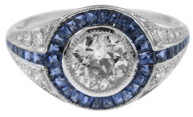 Old European Cut diamond=1/.77ct J-K SI1 Sapphires=40/.75tw Diamonds=34/.23tw F-G VS