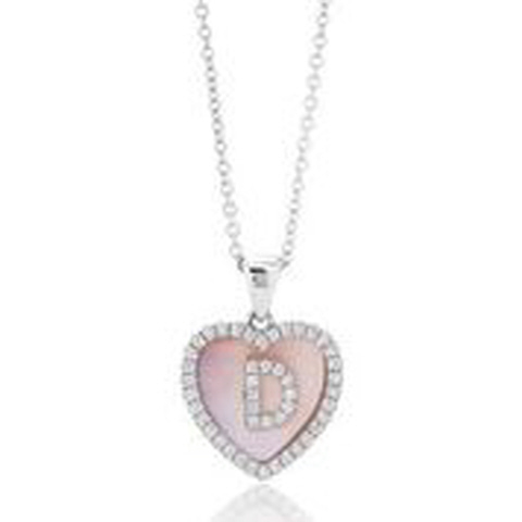 14kt white gold pink rainbow mother of pearl diamond "D" heart pendant with diamond border.