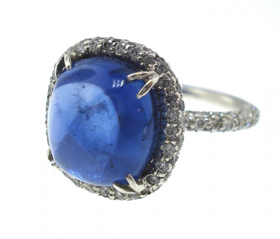 Platinum sugarloaf cabochon sapphire & diamond ring