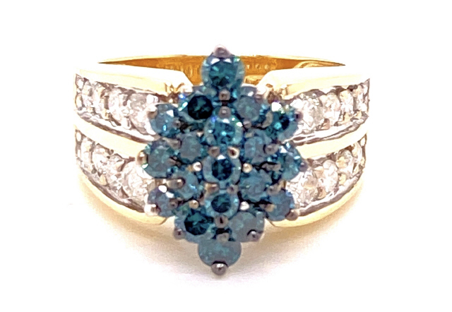 14kt yellow and white gold white diamond and irradiated blue diamond ring