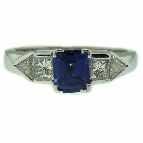 Sapphire: 1/.68ct Diamond Trillion: 2/0.25tw H/I SI-1 Diamond Princess Cuts: 2/0.30tw H/I SI-1