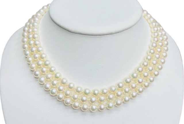 Three row 6.5mm pearl necklace with 14kt white gold diamond clasp