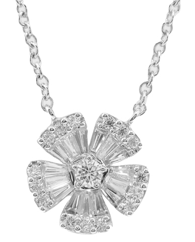 18kt white gold round and baguette diamond flower pendant with chain.