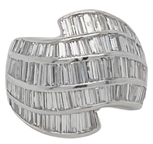 18kt white gold channel set baguette diamond ring.