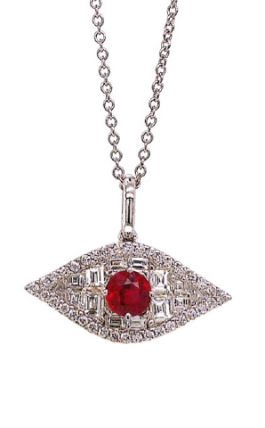 18kt white gold ruby and diamond evil eye pendant with chain.