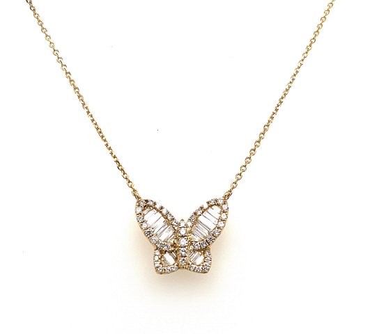 18kt yellow gold baguette and round diamond butterfly pendant with chain
