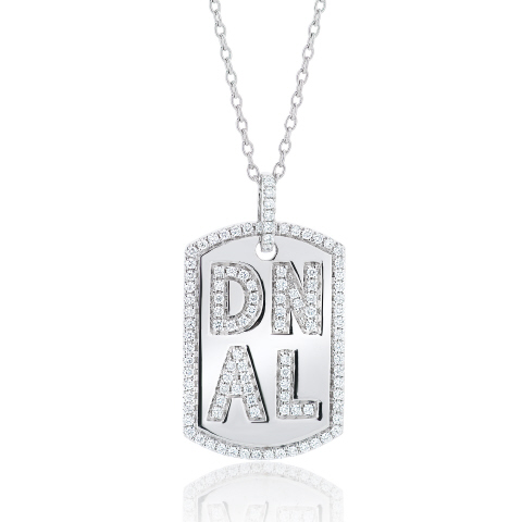 14kt white gold all diamond dog tag pendant with chain. "DNAL"