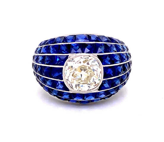 Platinum ring with Old Mine Cut diamond 2.04cts J-K SI3 EGL and French cut sapphires