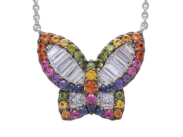18kt white gold diamond and rainbow sapphire butterfly pendant with chain
