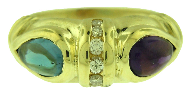 14kt yellow gold cabochon blue topaz, amethyst and diamond ring