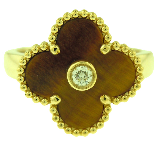 18kt yellow gold clover tiger eye and dimaond ring.