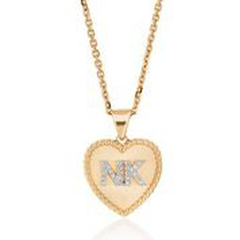 14kt yellow gold medium heart pendant with diamond "NK" initials and chain. Snap bale