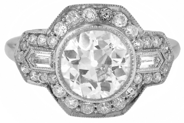 Platinum round and baguette diamond ring
