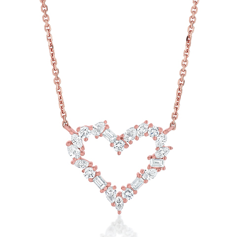 14kt rose gold mixed shape diamond heart pendant with chain.