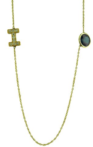 14kt yellow gold bezel set sapphire and diamond "I" necklace.