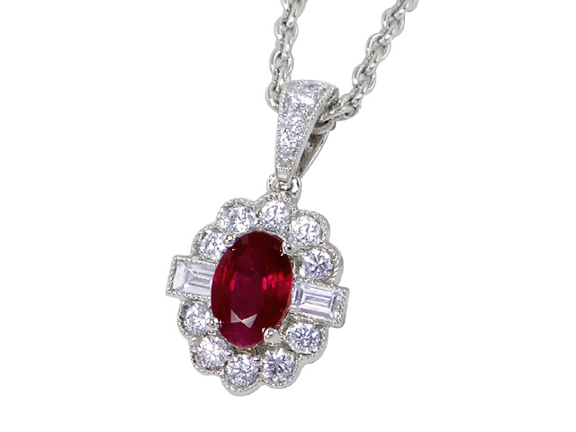 18kt white gold oval ruby and diamond pendant with chain