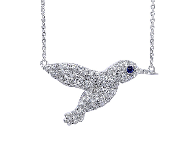 18kt white gold diamond hummingbird pendant with chain.