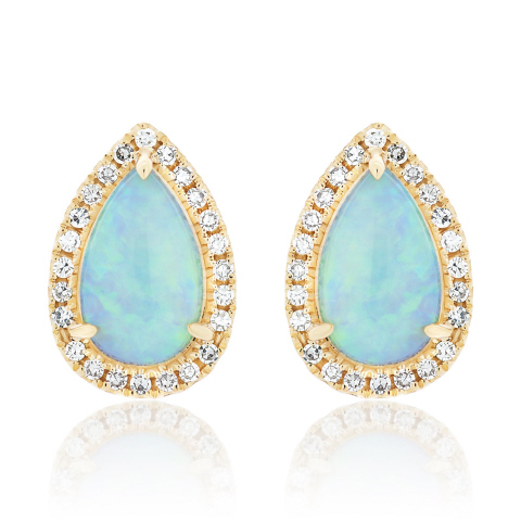 14kt yellow gold pear shape opal and diamond halo style earrings.