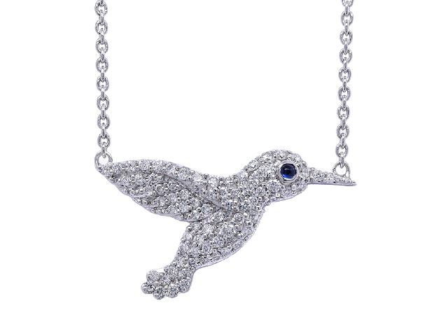 18kt white gold diamond hummingbird pendant with chain.