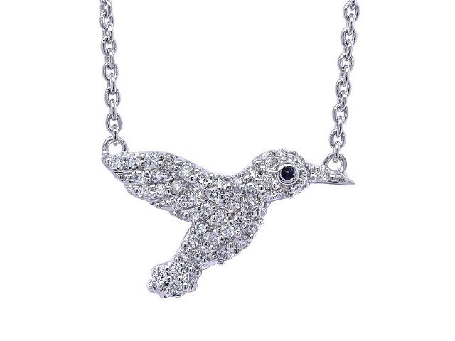 18kt white gold diamond hummingbird pendant with chain.