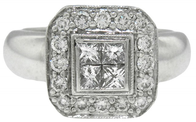 Princess cut diamonds=4/.36tw+/- F-G VS Round diamonds=16/.31tw+/- G-H VS