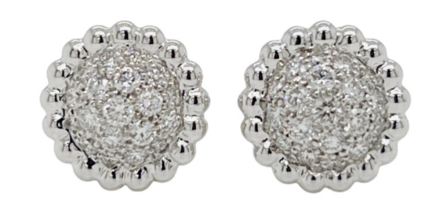 18kt white gold pave diamond ball earrings with beaded edge.