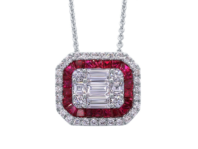 18kt white gold ruby and diamond pendant with chain.
