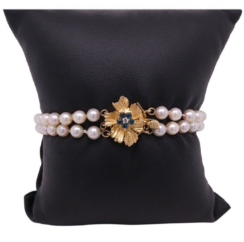 14kt yellow gold sapphire and diamond catch with double row pearl bracelet
