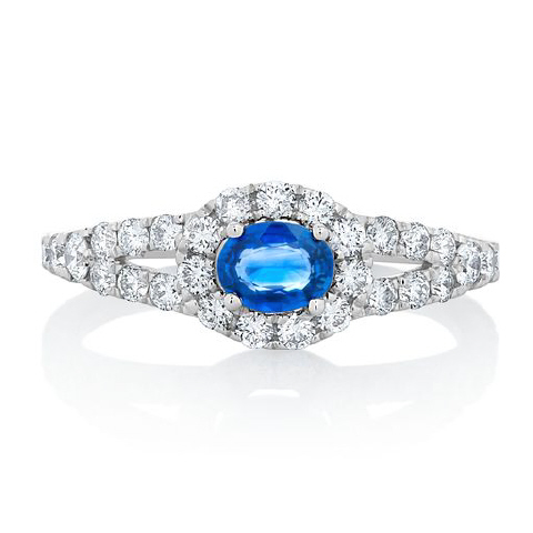 14kt white gold oval sapphire and diamond ring.