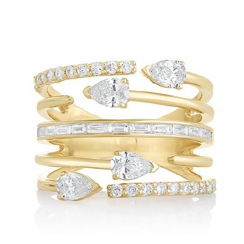 14kt yellow gold 5 row round, pearshape and baguette diamond cage ring
